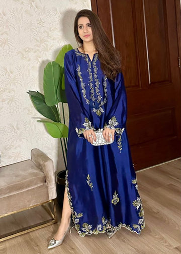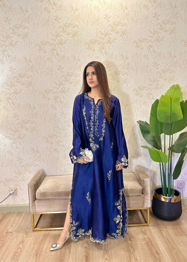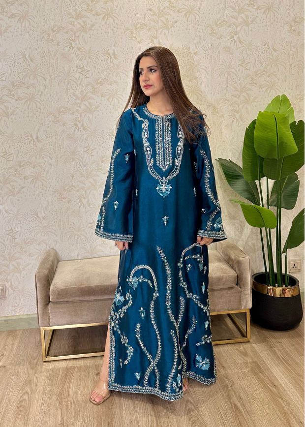 Sapphire is a striking blue pure sheesha silk kaftan embellished with delicate mirror work and...