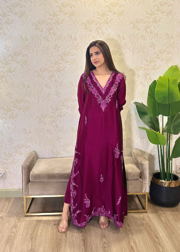 Ayraa is a vibrant magenta pure sheesha silk ensemble featuring delicate mirror work, intricate embroidery,...