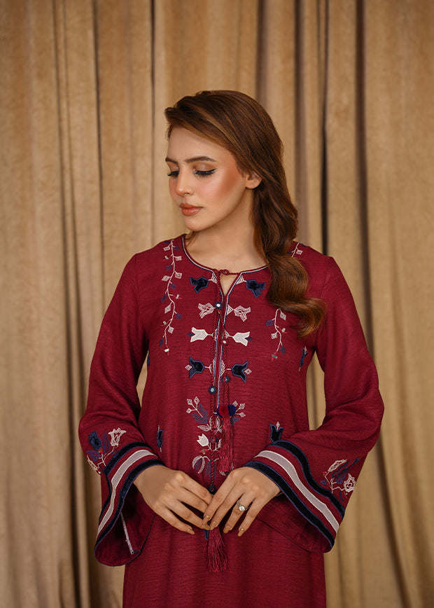 Minha is a rich maroon Irish linen kaftan adorned with velvet patchwork and fine embroidery....