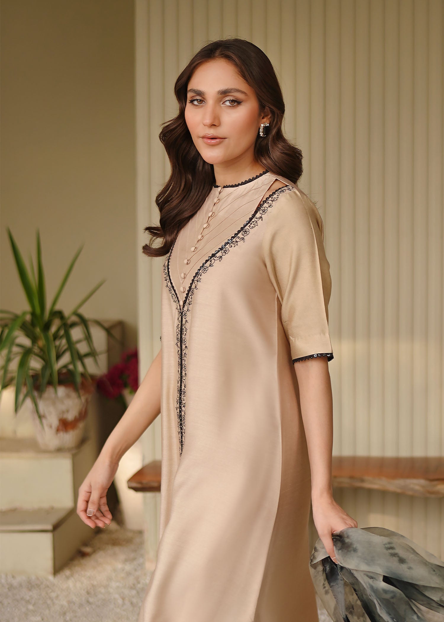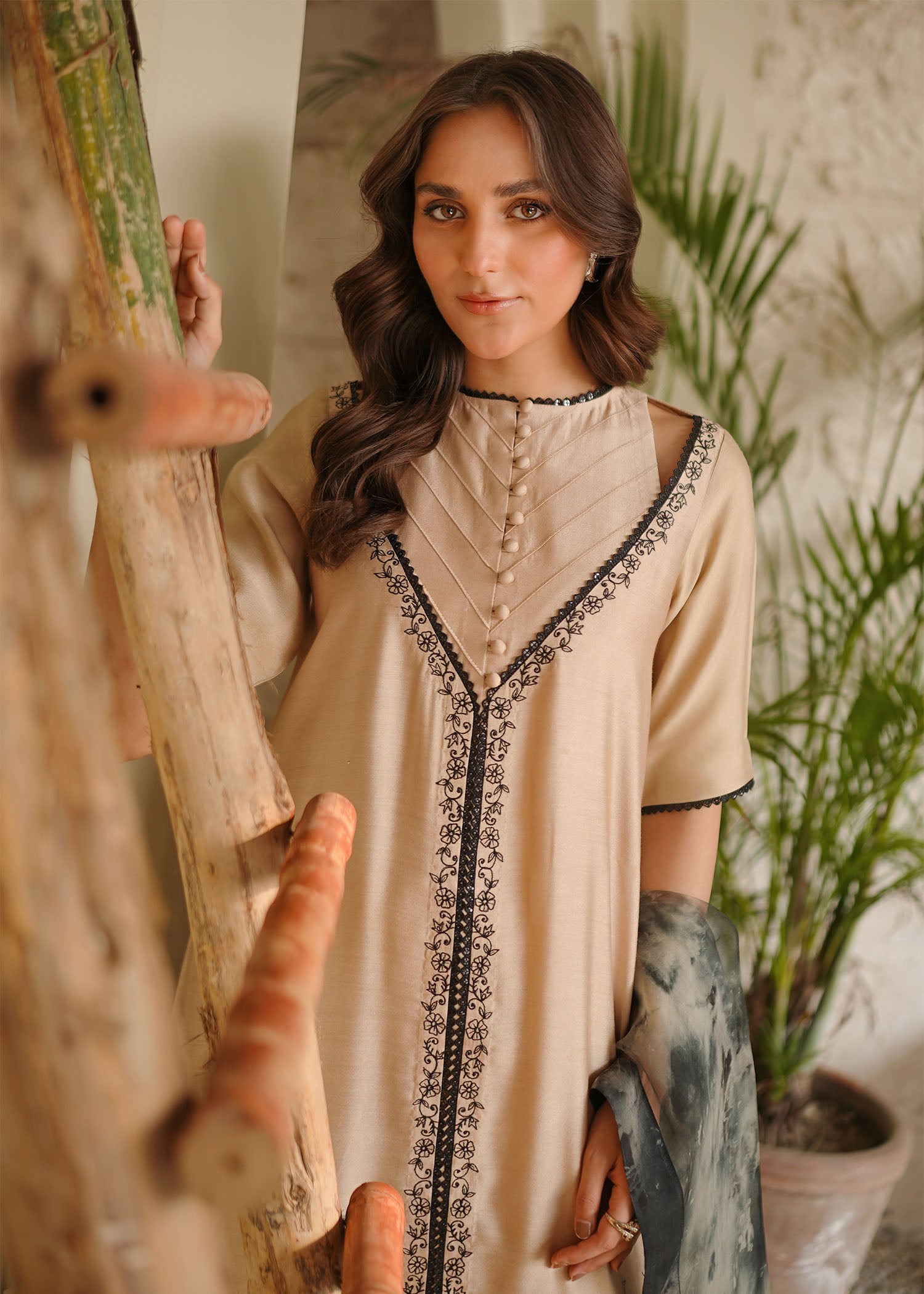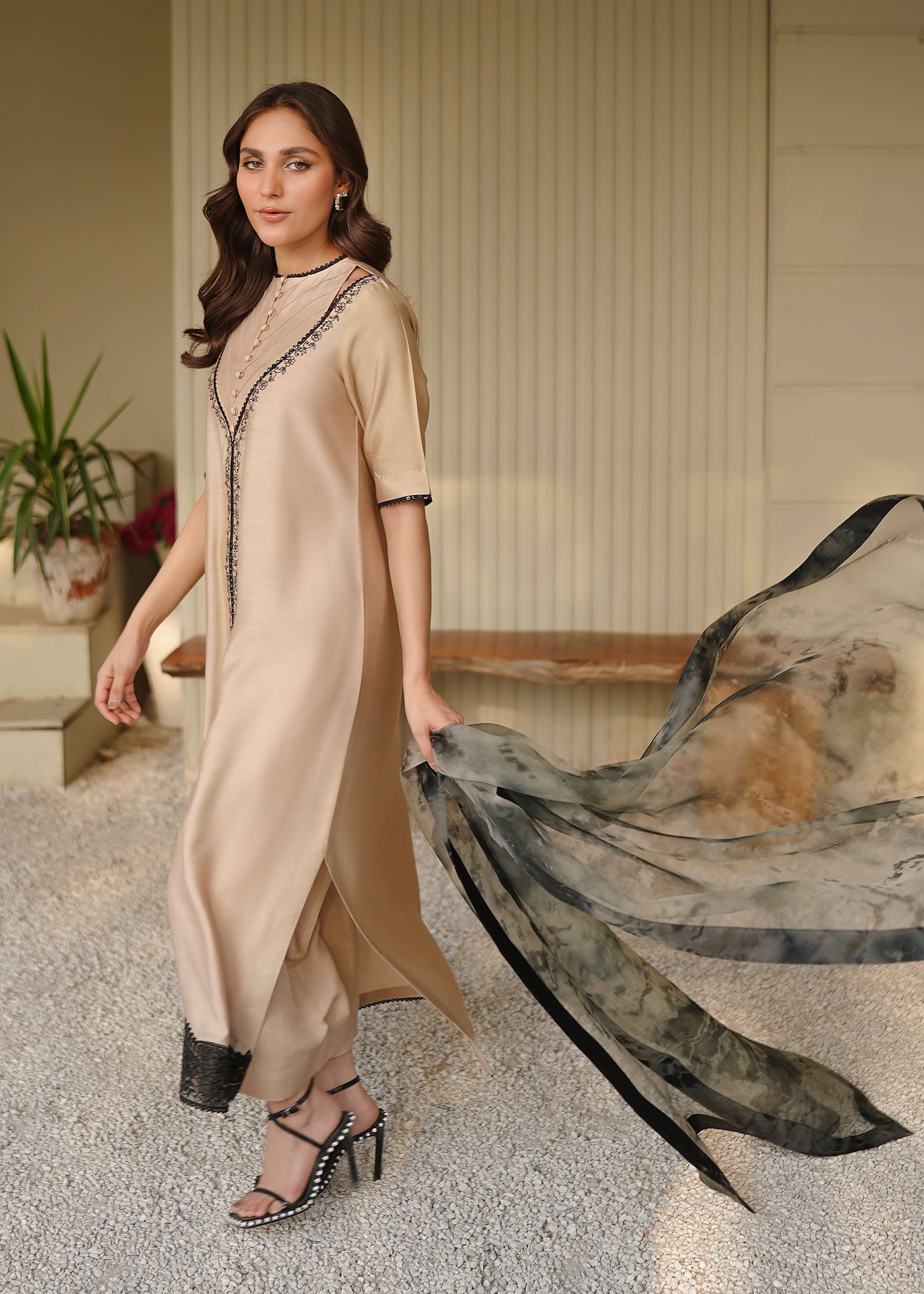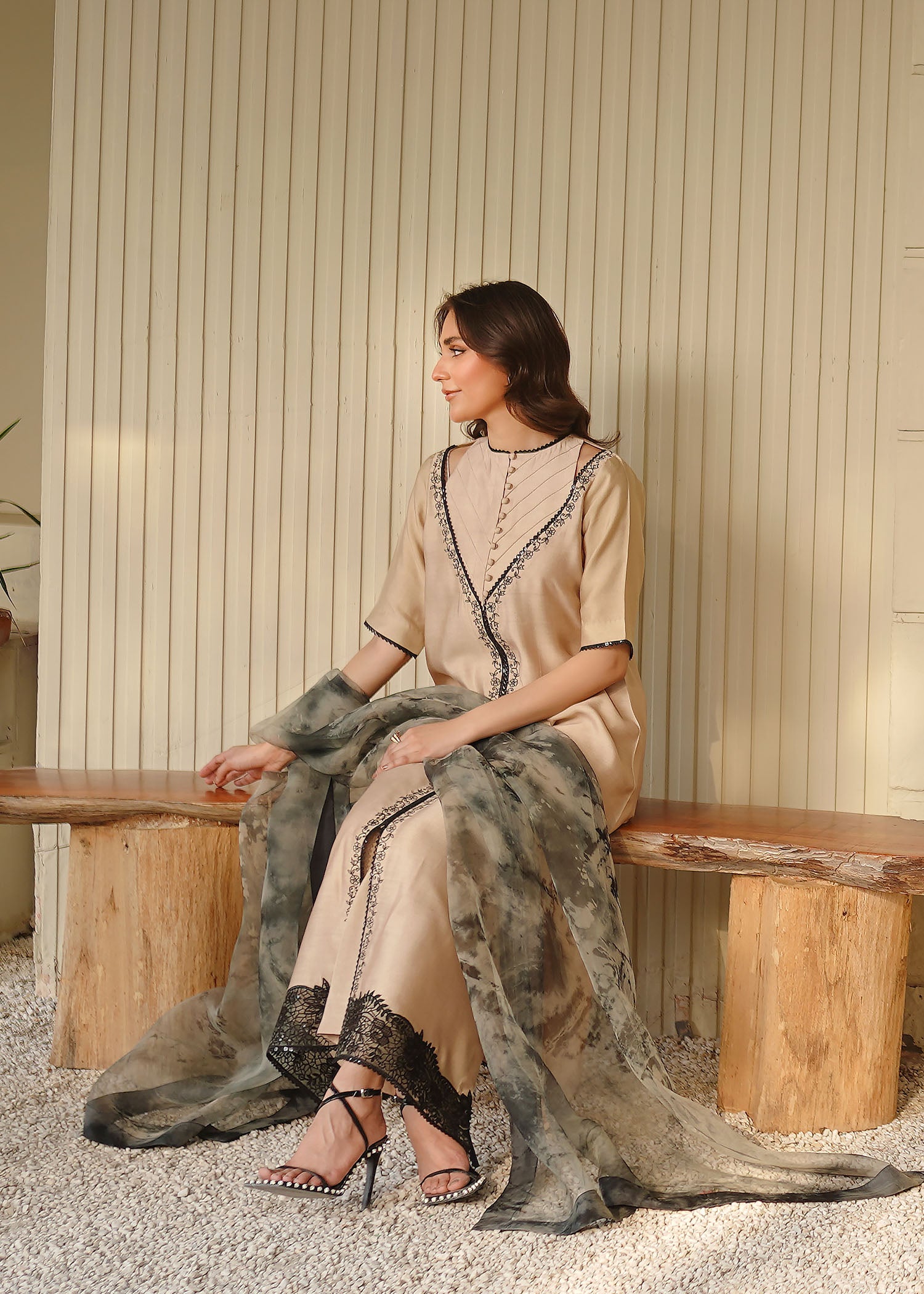 Elegant Khadi silk long shirt paired with viscose tapered trousers. Features intricate hand embroidery, delicate lace accents, and loop button detailing at the neckline. Comes with a beautifully dyed pure organza tie-dye dupatta for a graceful finish.