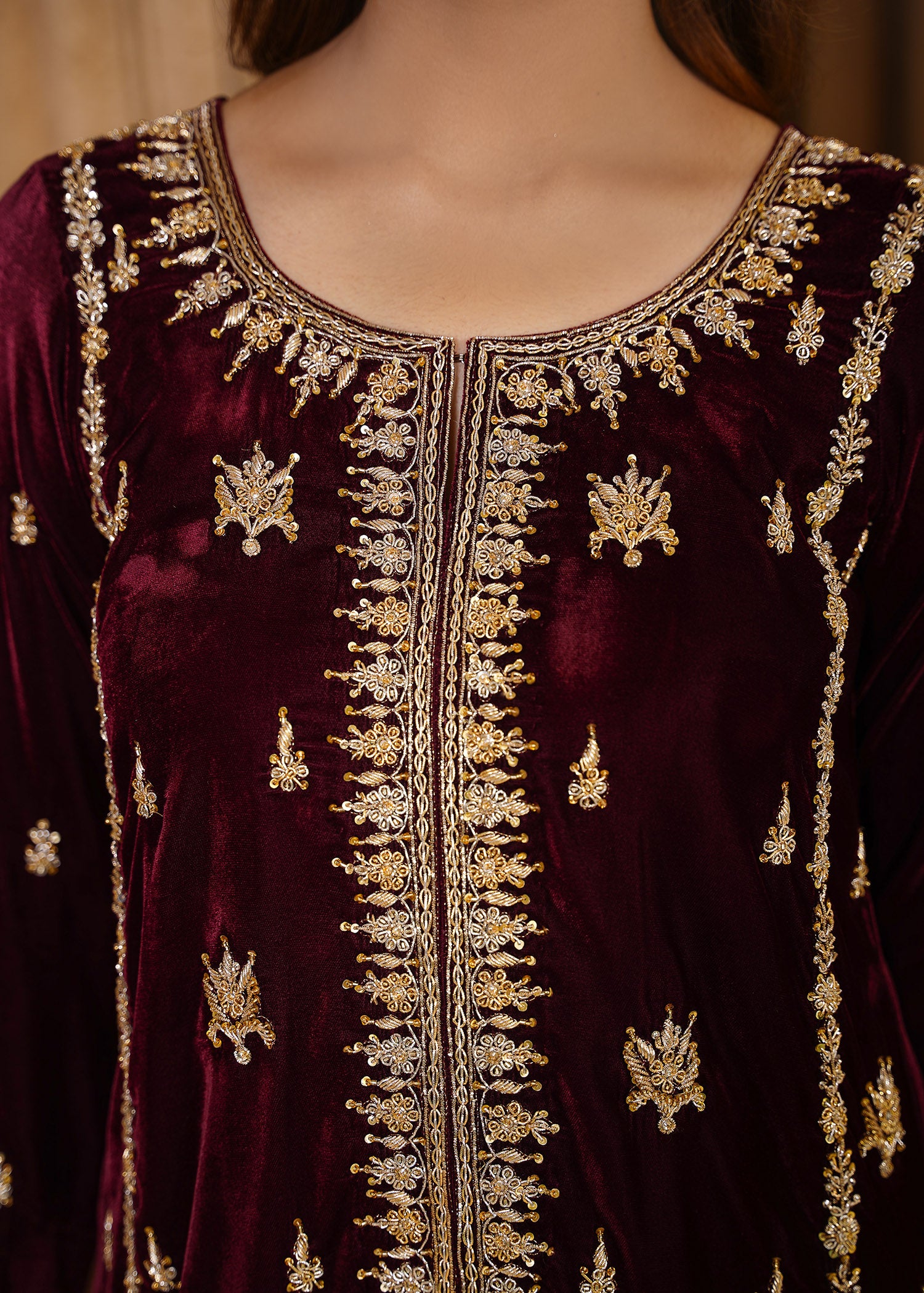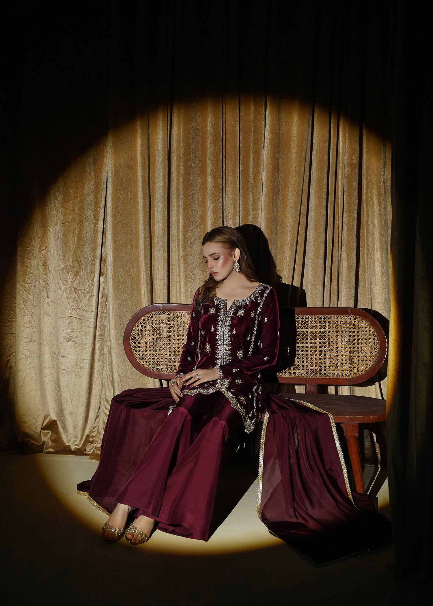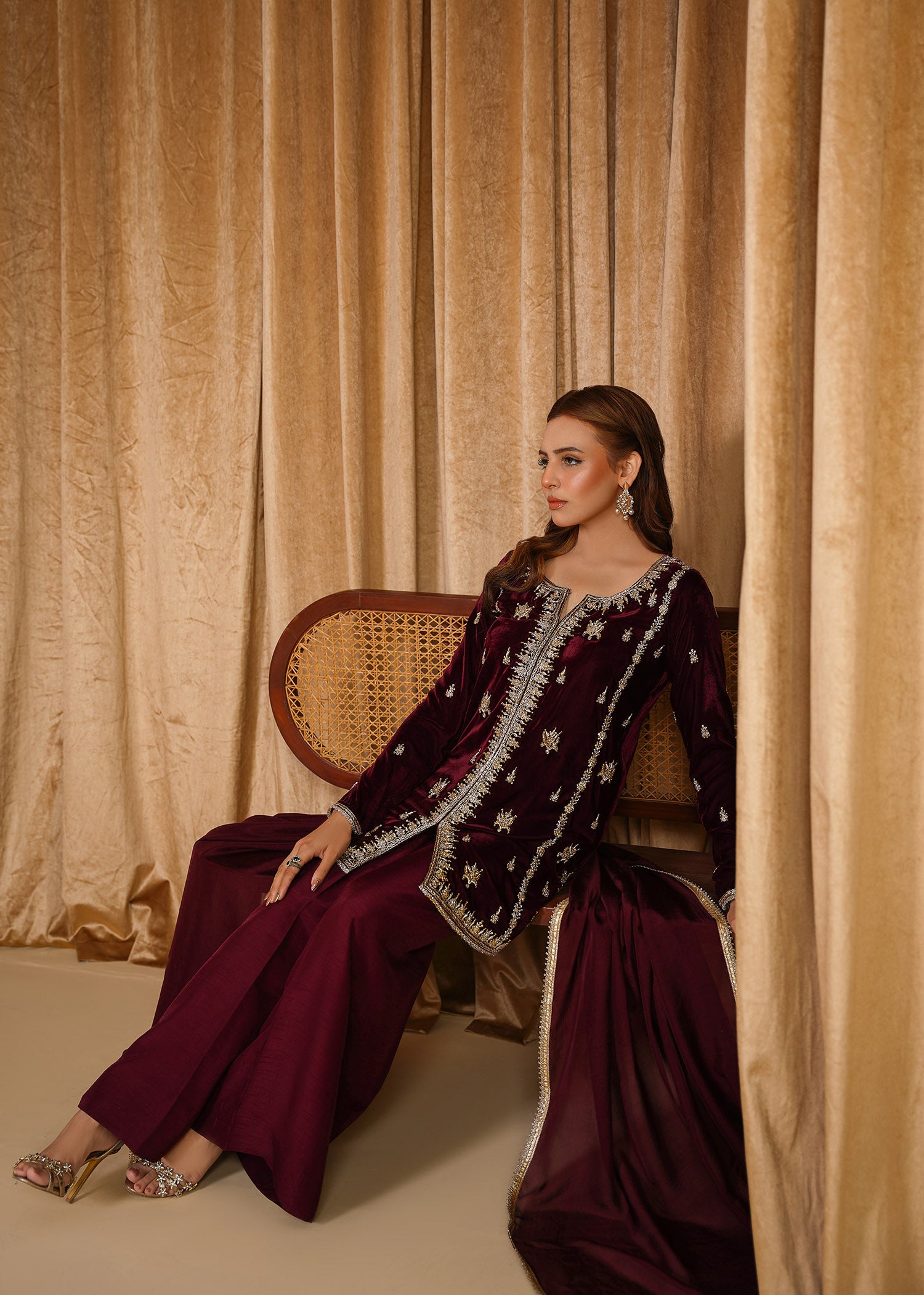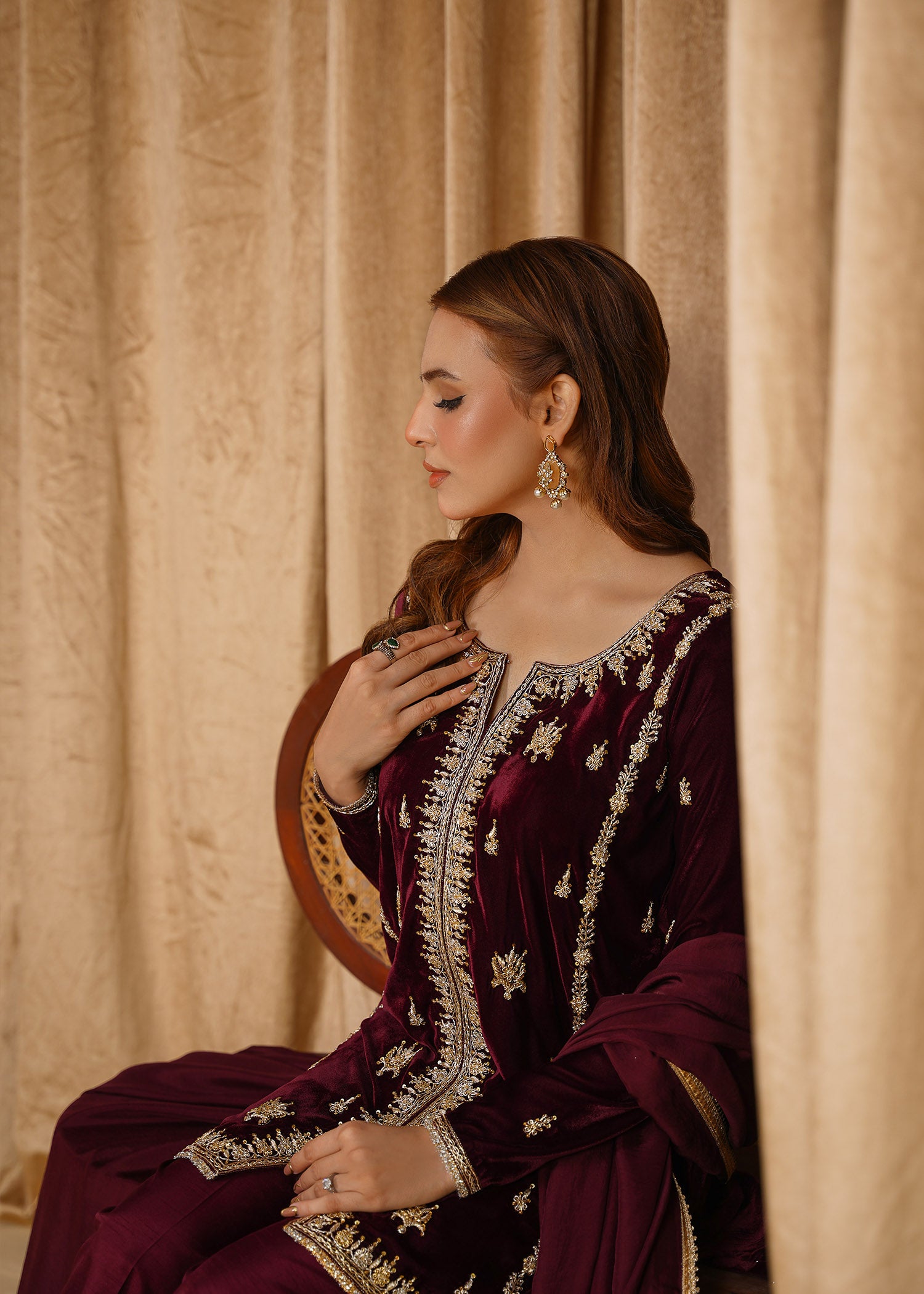 Afsaneh β an opulent velvet jacket embellished with exquisite zardozi handwork throughout, beautifully accentuated with delicate kiran lace trims. It is paired with Korean raw silk pants and a pure silk dupatta edged with golden lace, creating a timeless and regal festive look.
