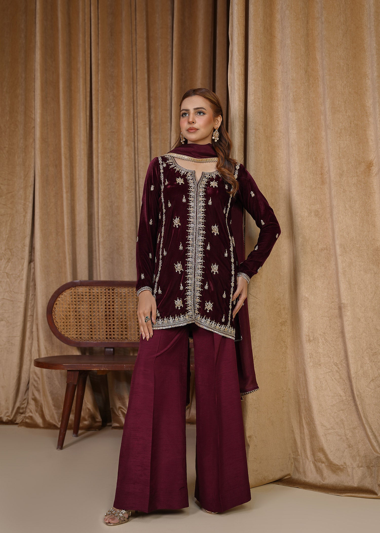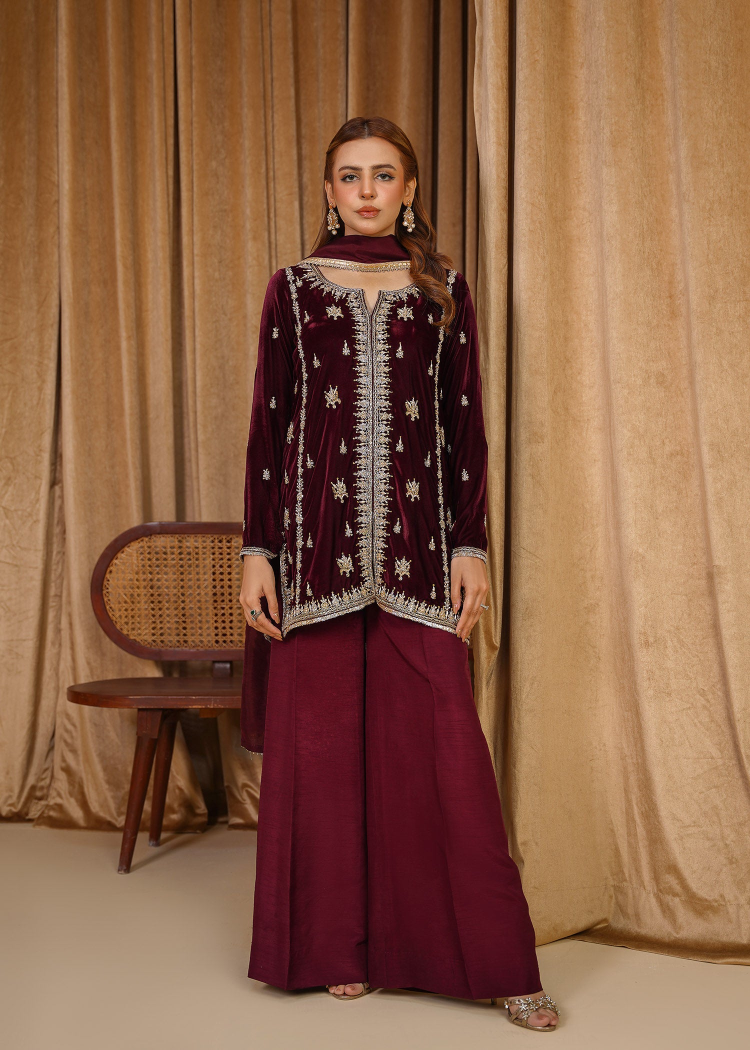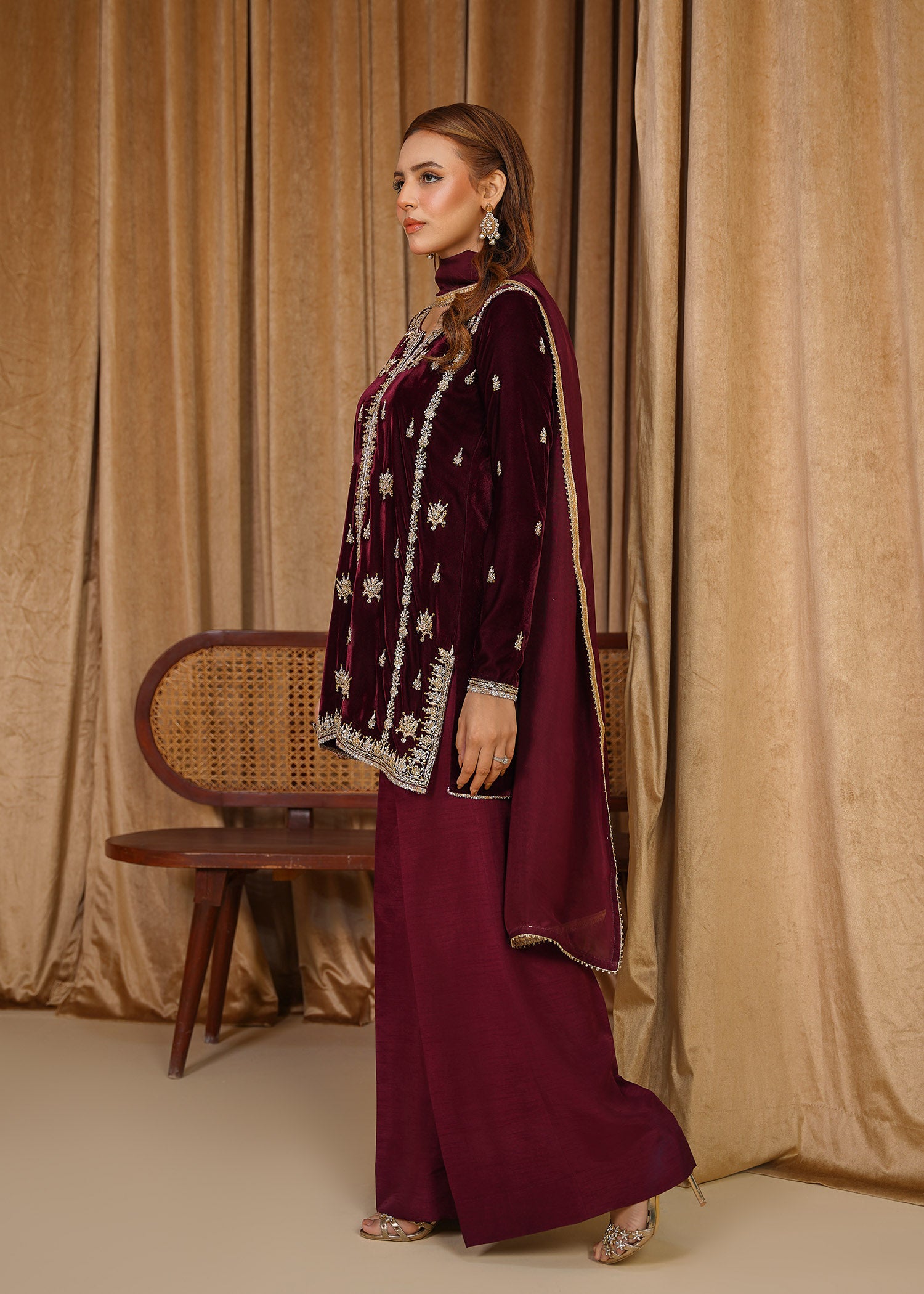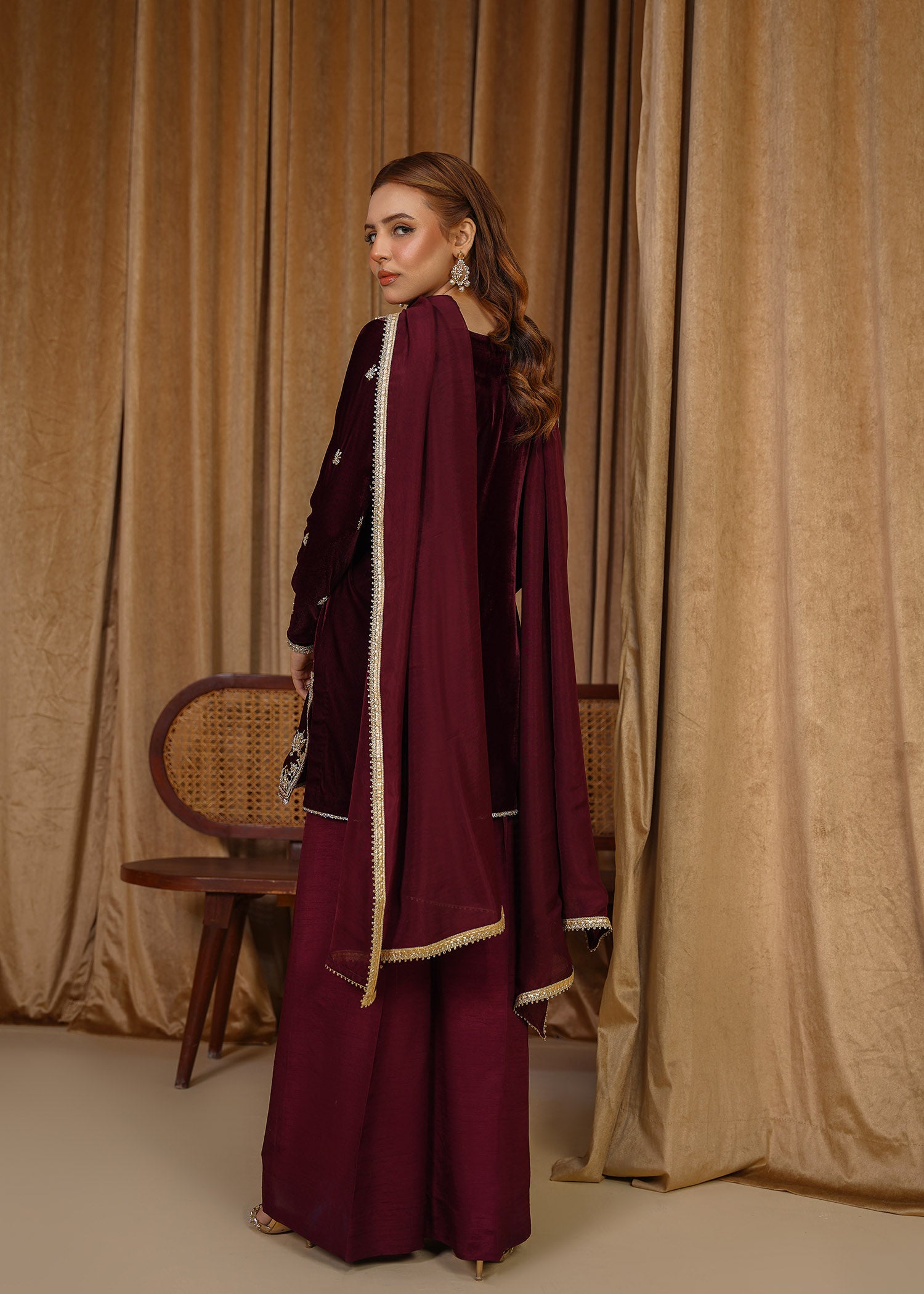Afsaneh β an opulent velvet jacket embellished with exquisite zardozi handwork throughout, beautifully accentuated with delicate kiran lace trims. It is paired with Korean raw silk pants and a pure silk dupatta edged with golden lace, creating a timeless and regal festive look.