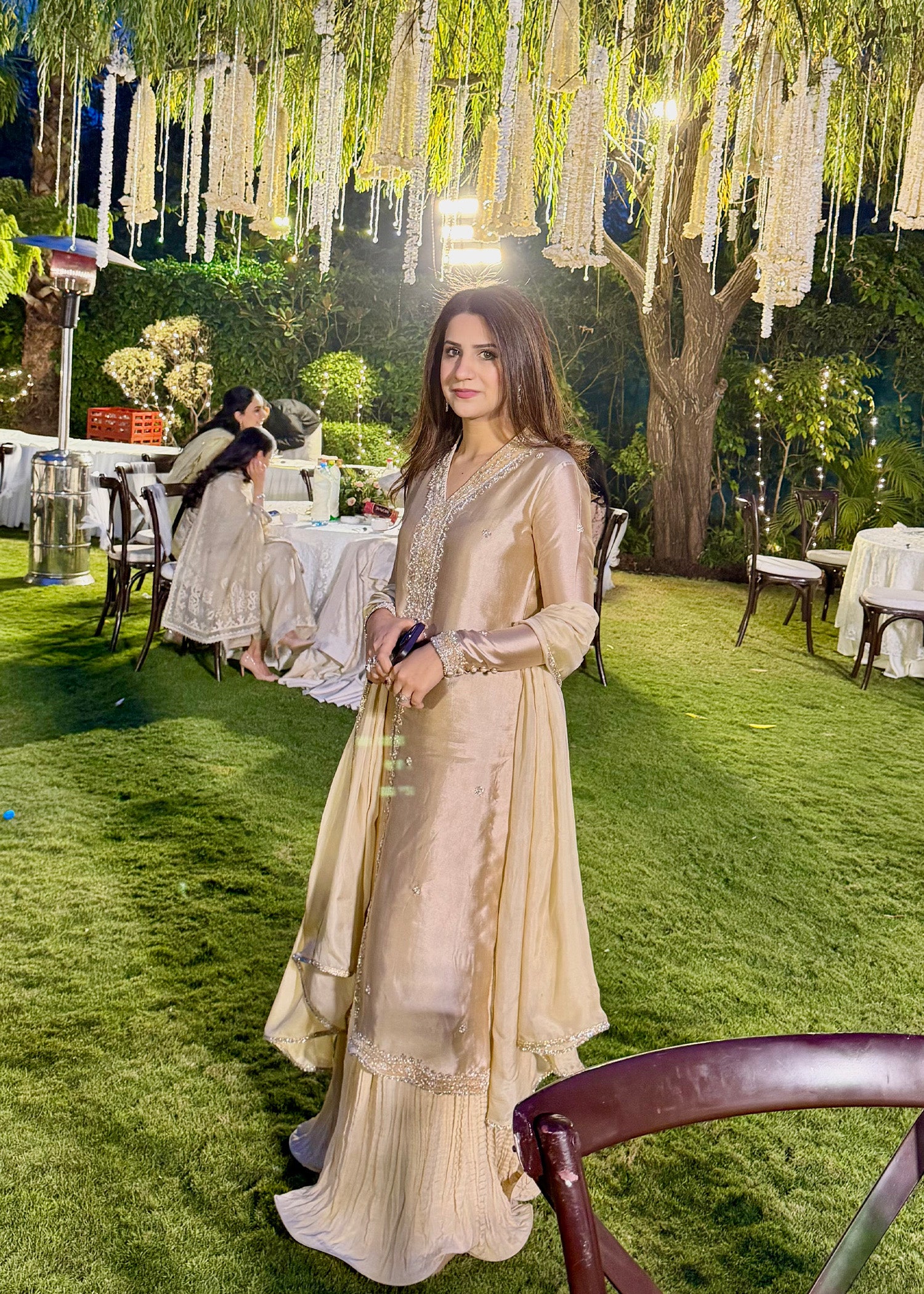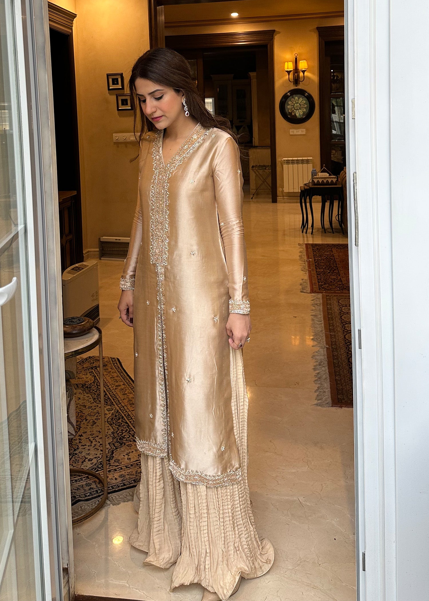 Ainaa is a resplendent pure sheesha silk ensemble, adorned with luminous gold and silver embellishments that reflect refined traditional artistry. Paired with delicately crushed raw silk palazzo pants and complemented by a silk dupatta finished with classic kiran lace, this look embodies heritage elegance with a contemporary sensibility.