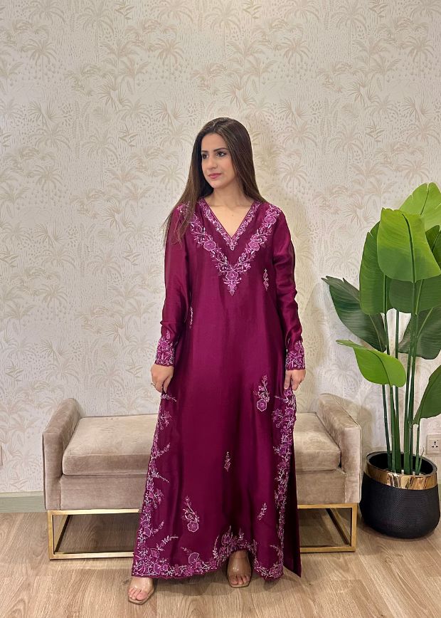 Ayraa is a vibrant magenta pure sheesha silk ensemble featuring delicate mirror work, intricate embroidery, and refined patchwork detailing. Its rich sheen and craftsmanship create a timeless festive look, effortlessly blending elegance with statement charm.