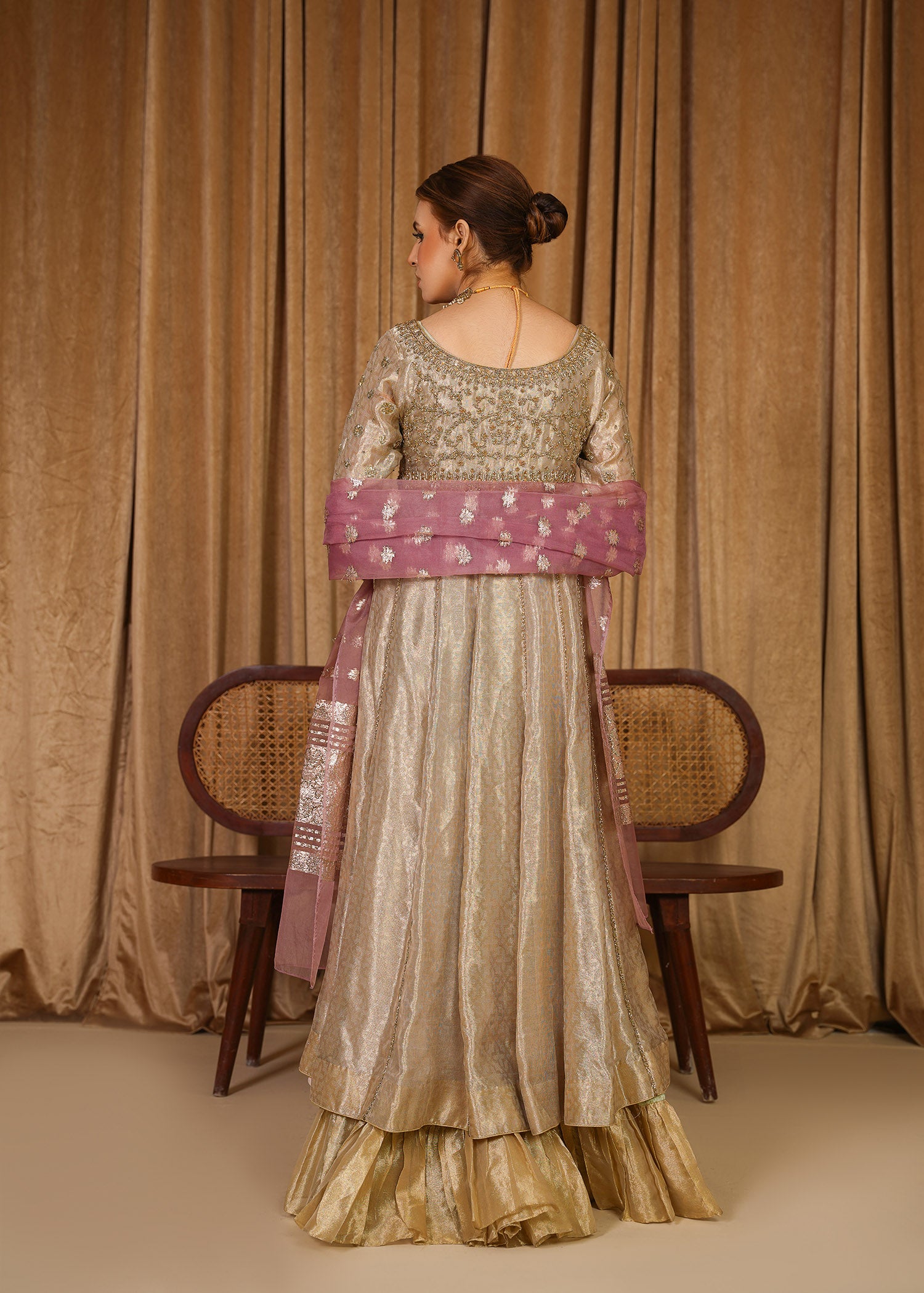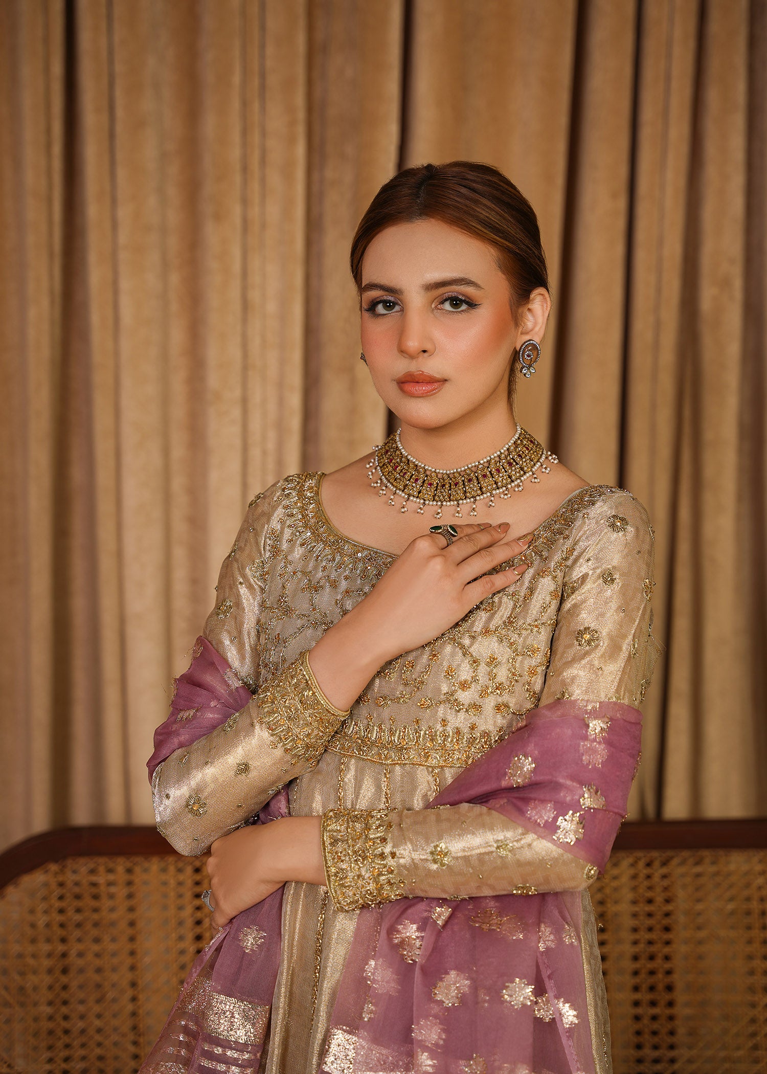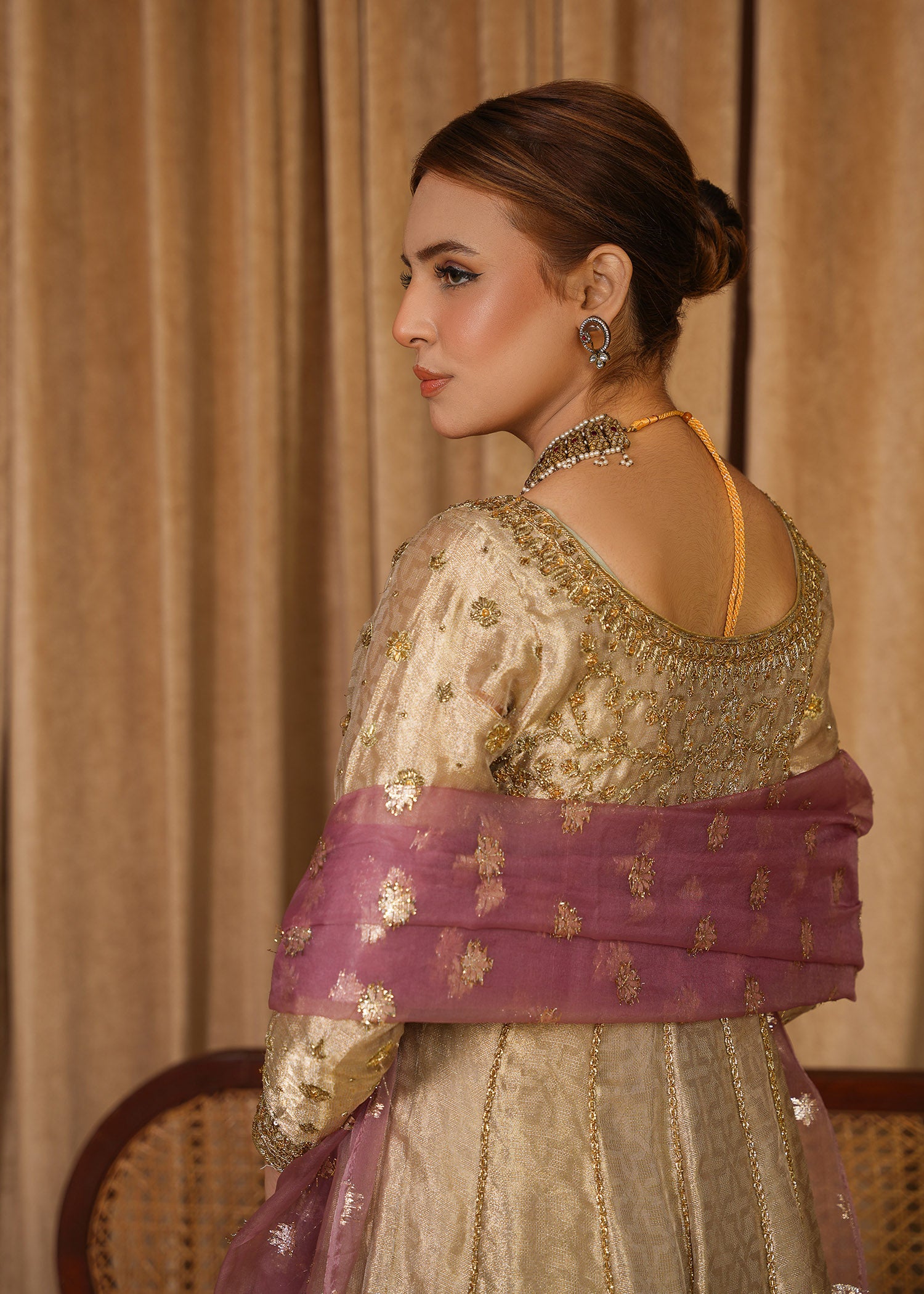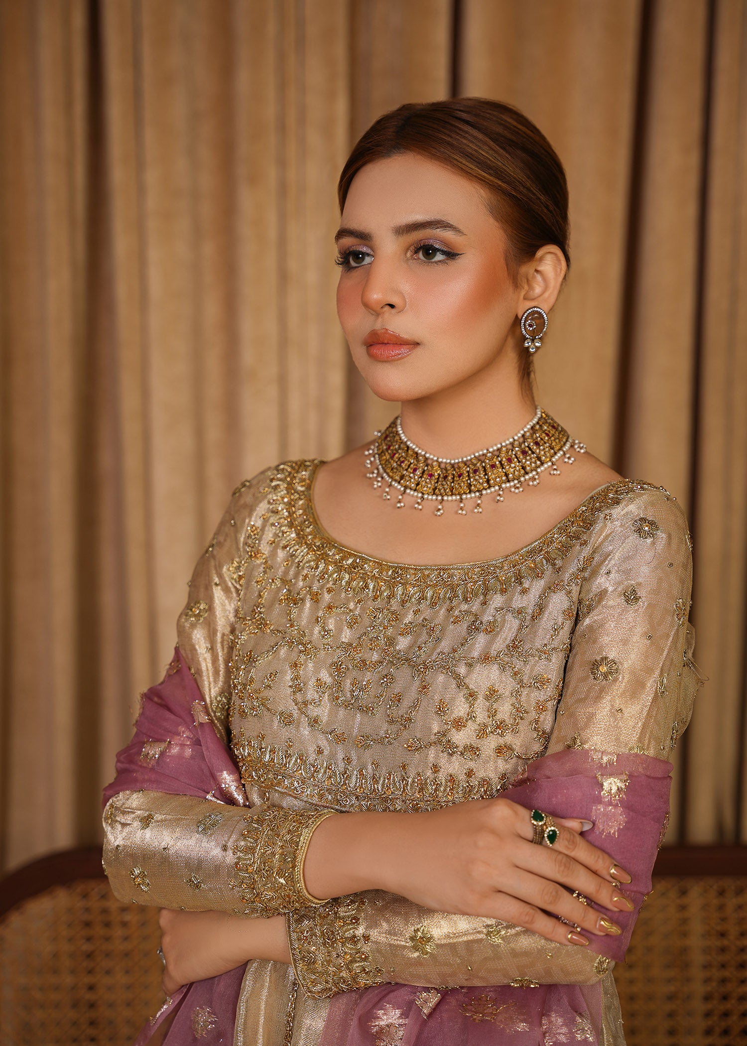 Maya β a statement piece crafted from pure tissue organza, featuring a beautifully hand-embellished neckline, dainty booti spray, and refined side slit detailing. It comes with a crushed inner slip and is paired with Korean raw silk palazzo pants. The ensemble is completed with an ethereal handworked organza dupatta adorned with phishwas for an effortlessly regal look.