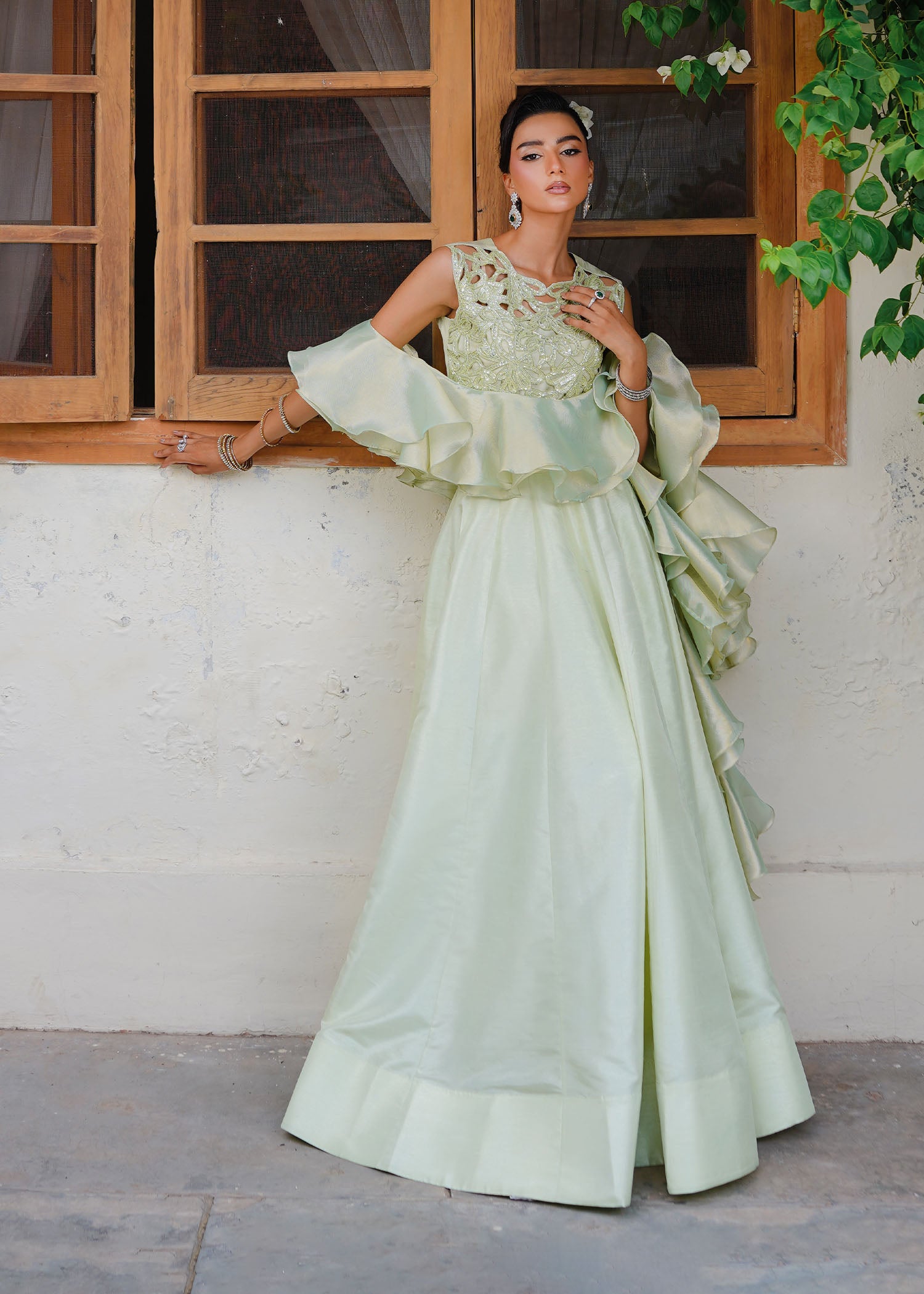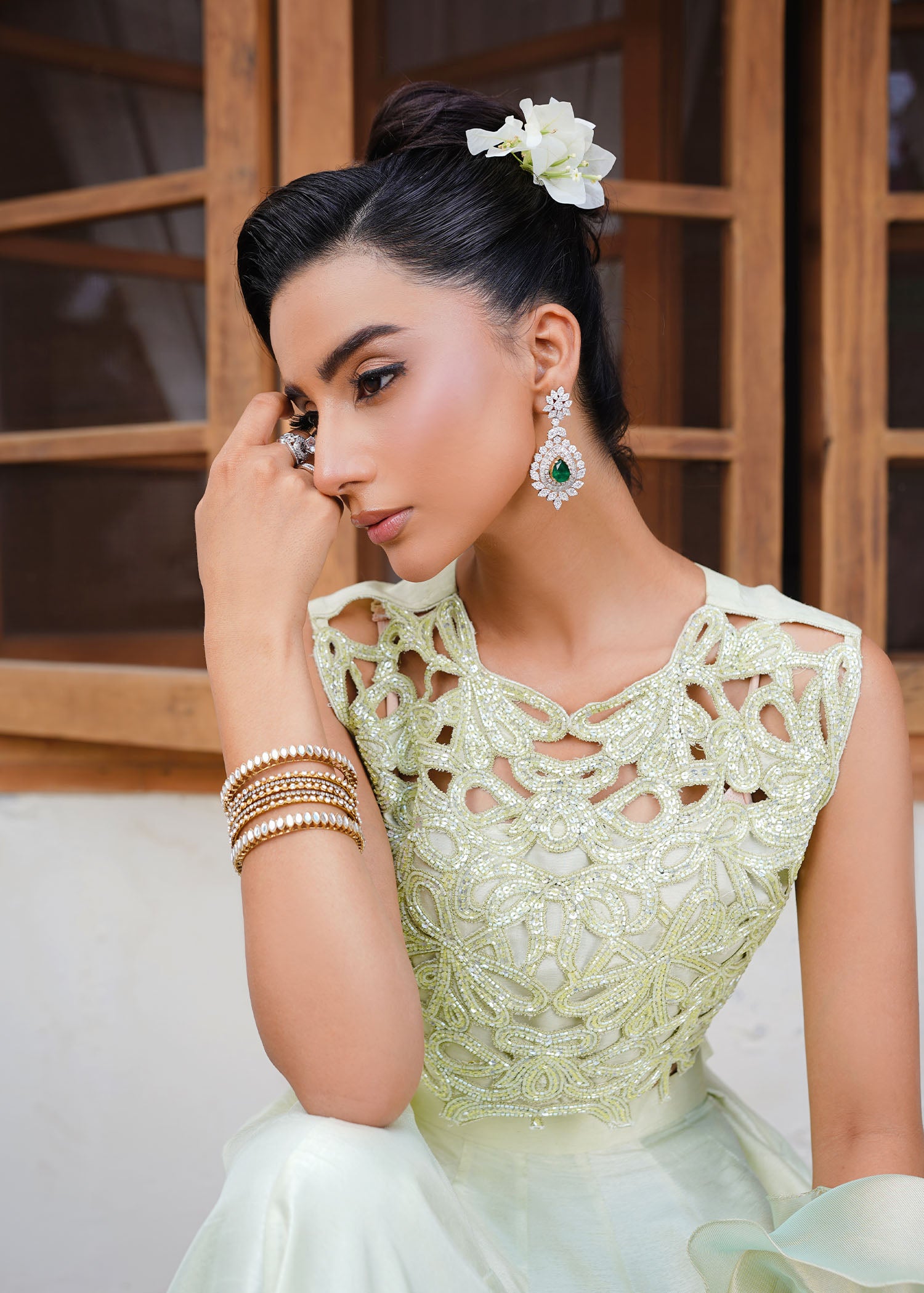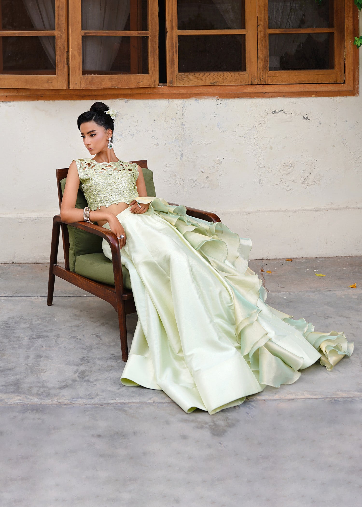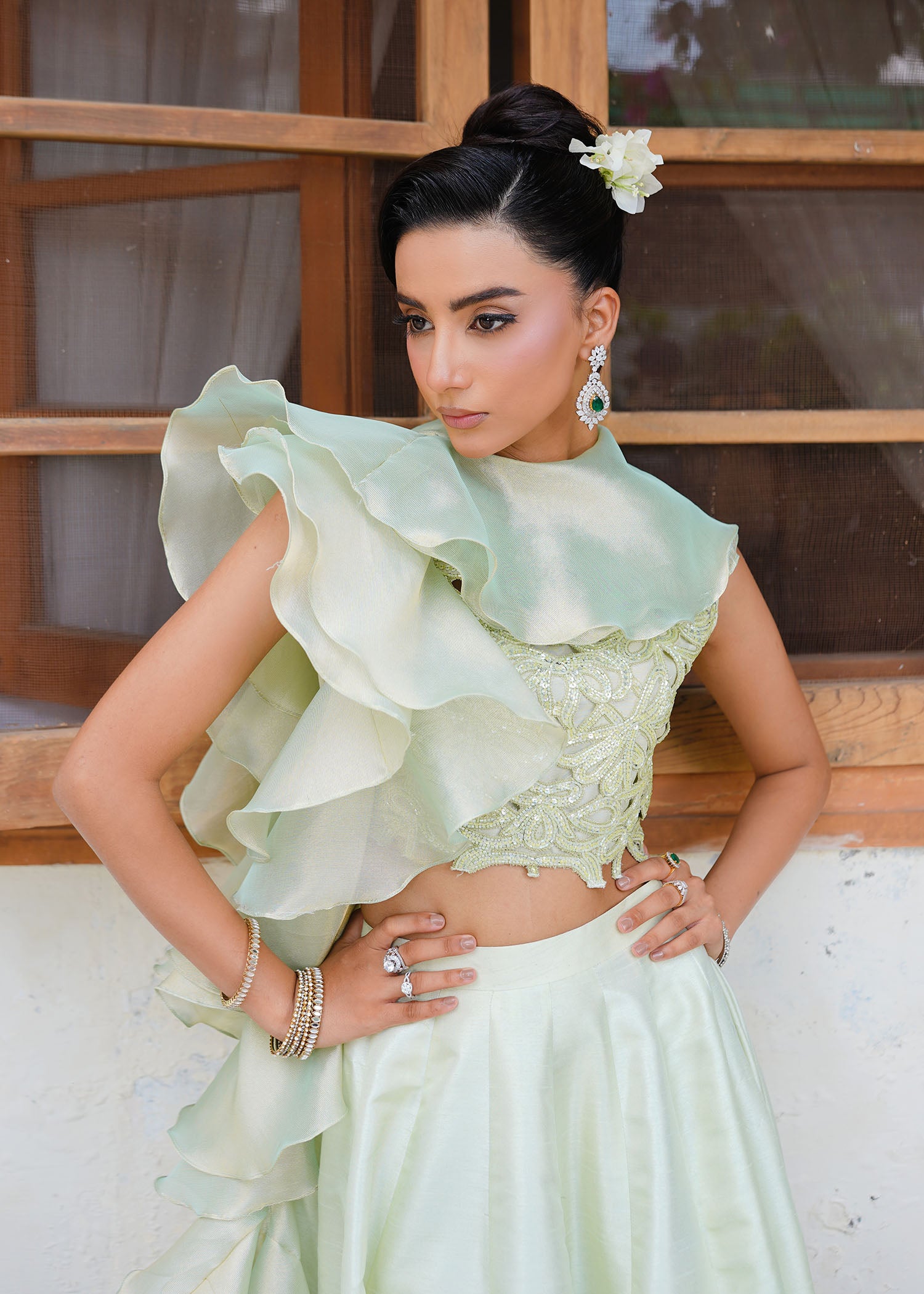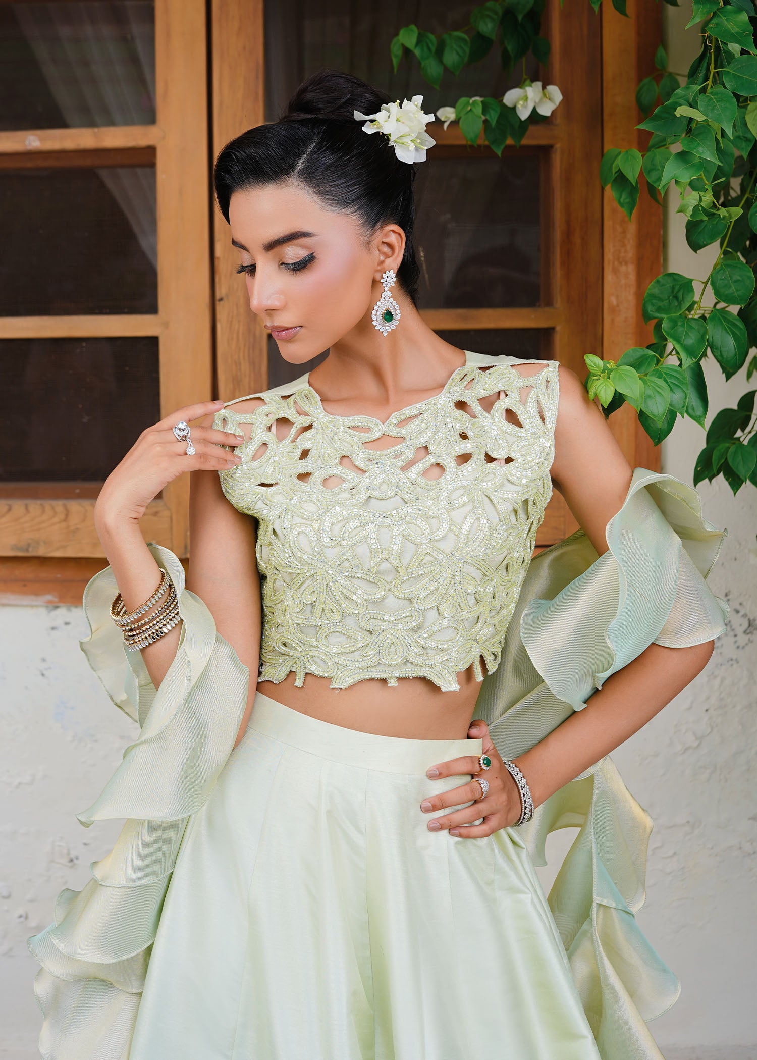 Nihan, a hand-embellished choli with intricate cutwork, paired with a raw silk lehenga and a ruffled tissue organza dupatta for graceful elegance.