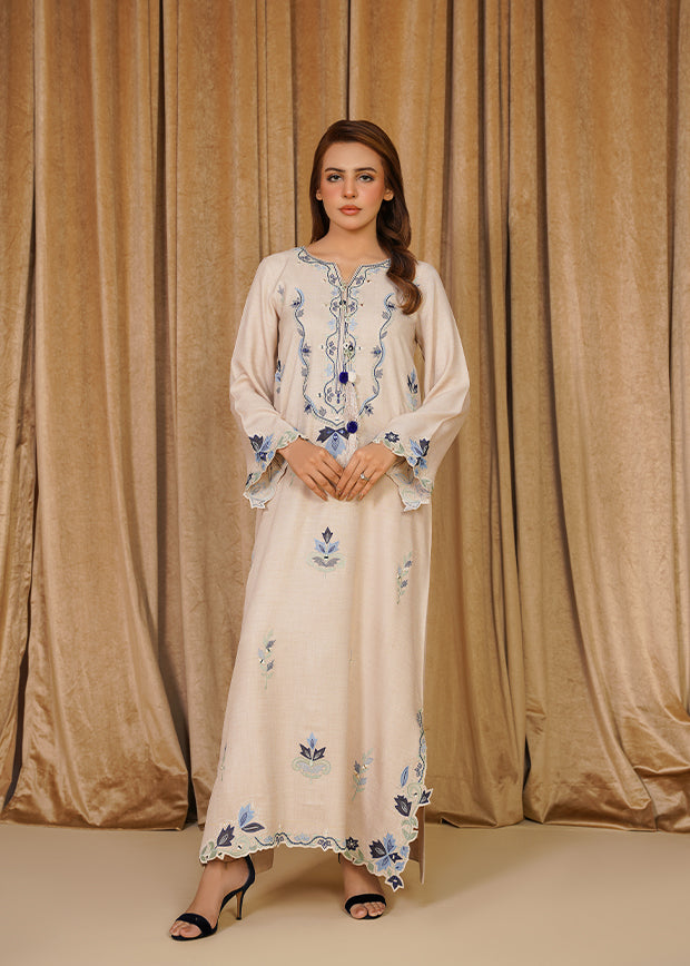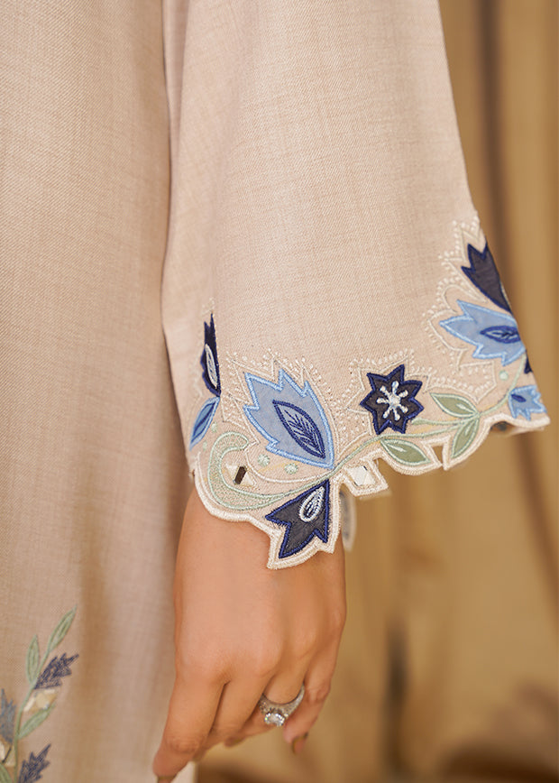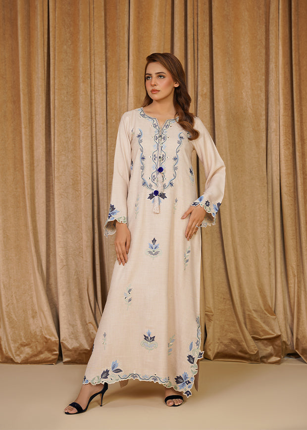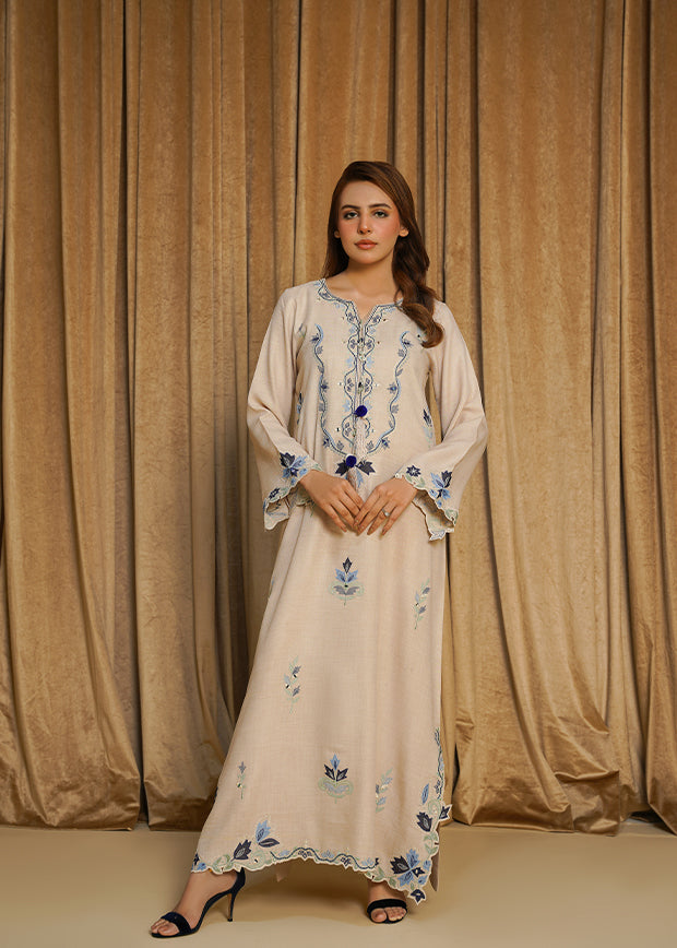 Roha is a chic white Irish linen kaftan featuring velvet patchwork with intricate embroidery. Finished with elegant tassels on the neckline, it blends simplicity with refined detailing for an effortlessly graceful look.