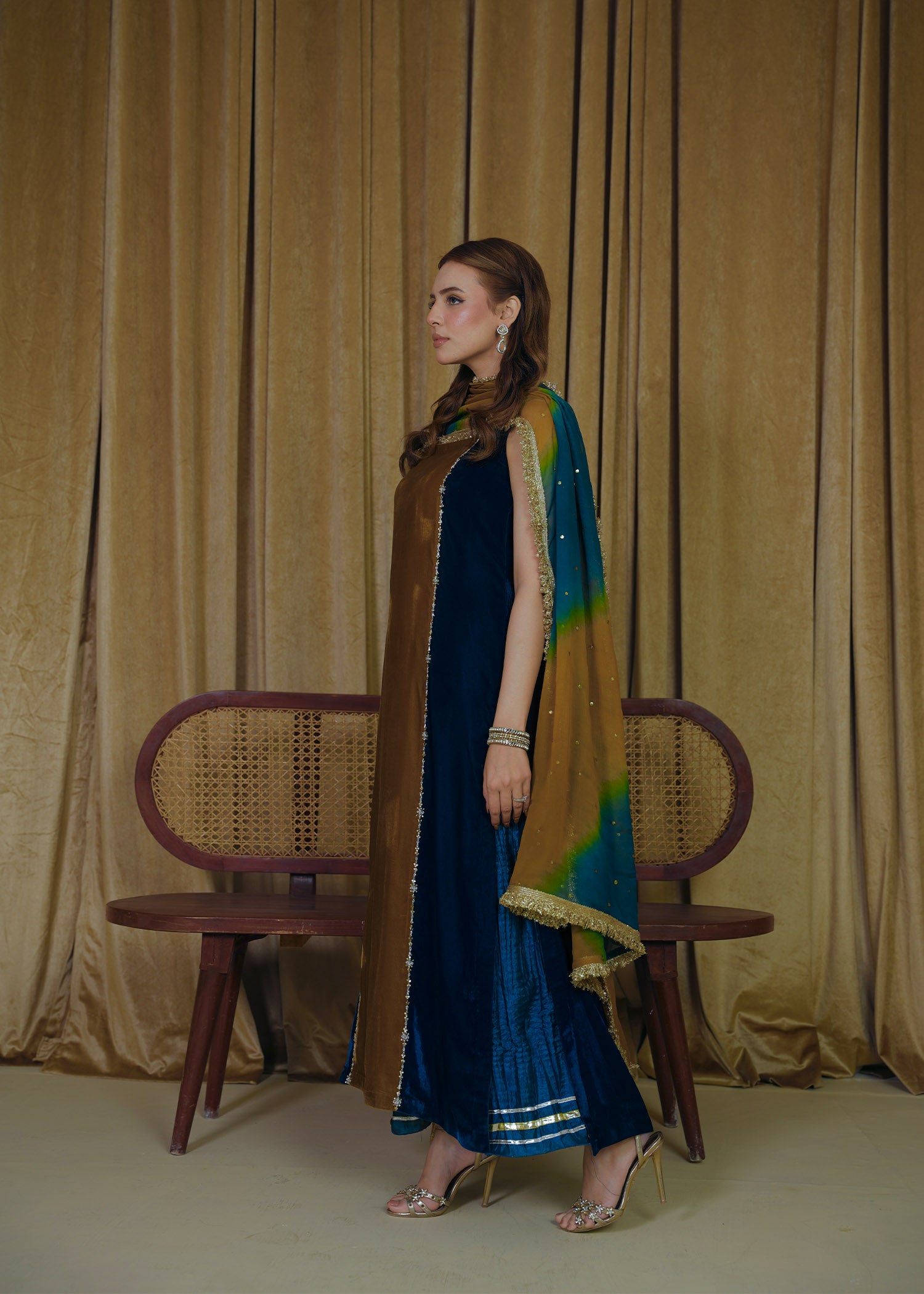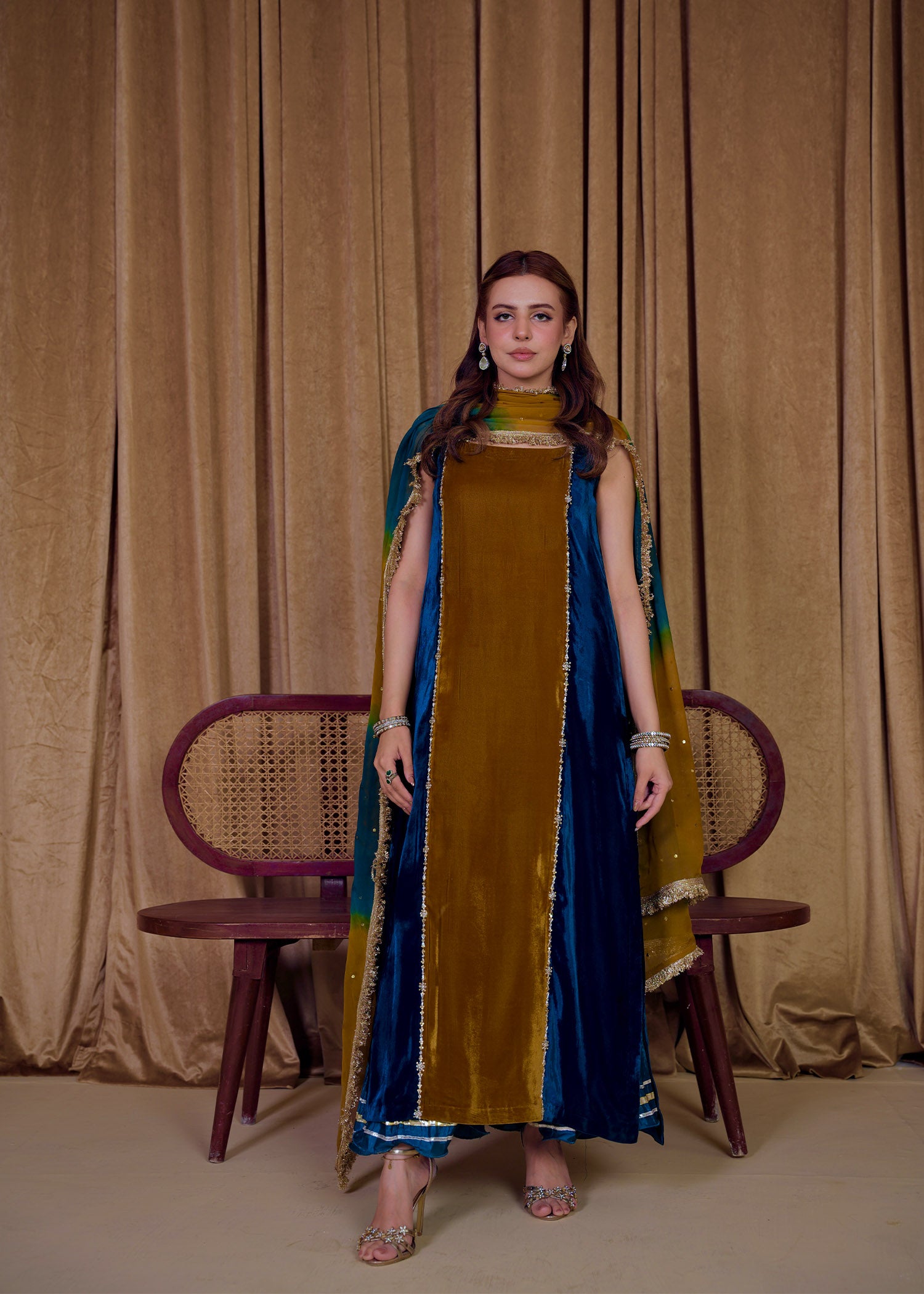 Ghazal β a timeless velvet ensemble featuring exquisite zardozi work on the shirt panels, paired with crushed silk culottes adorned with delicate gota detailing. The look is elevated with a two-toned mukesh chiffon dupatta edged with traditional kiran lace, blending elegance and festive charm effortlessly.
